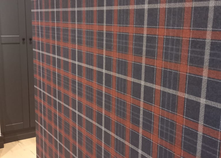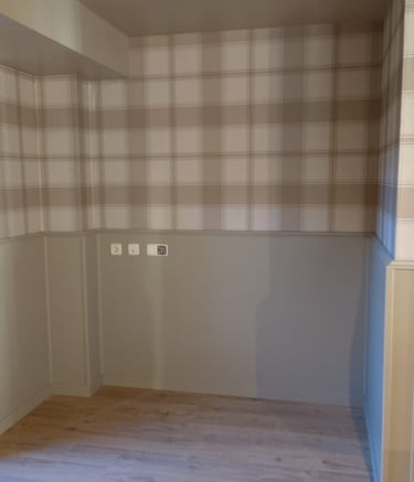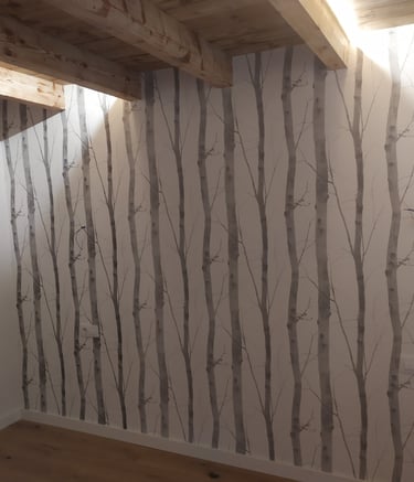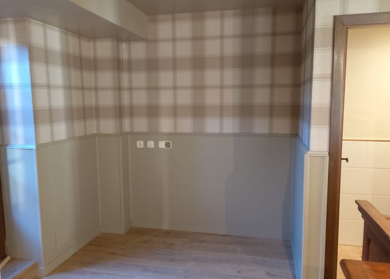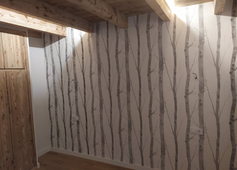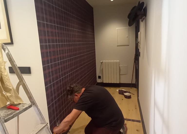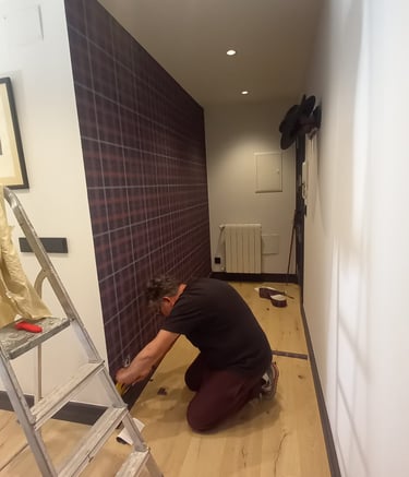 Según el tipo de papel (vinílico, tejido no tejido, papel tradicional, etc.), aplicamos el adhesivo en la pared o en el reverso del papel. Utilizamos colas específicas que aseguran una fijación duradera sin dañar el material.